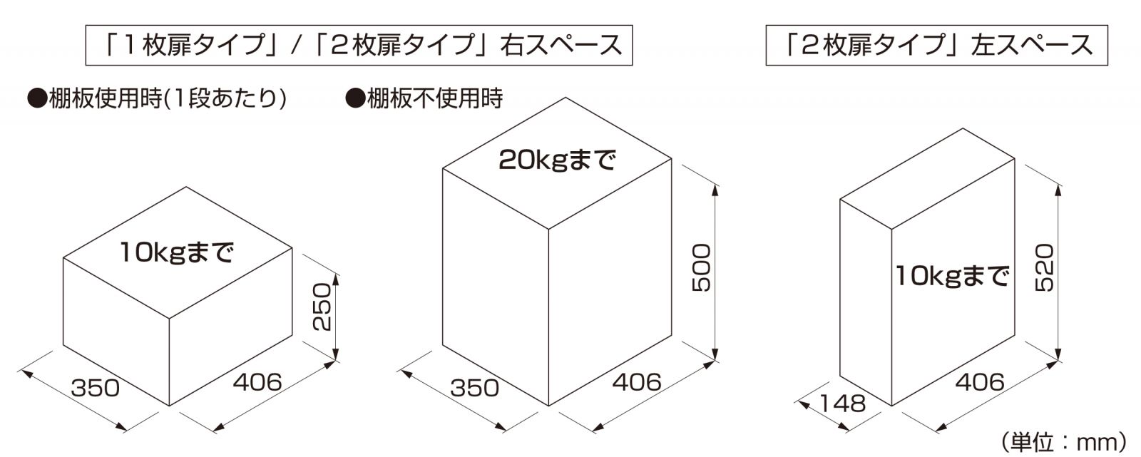2枚扉タイプ: 閉じた時 ・ 棚板不使用時 ・ 棚板使用時