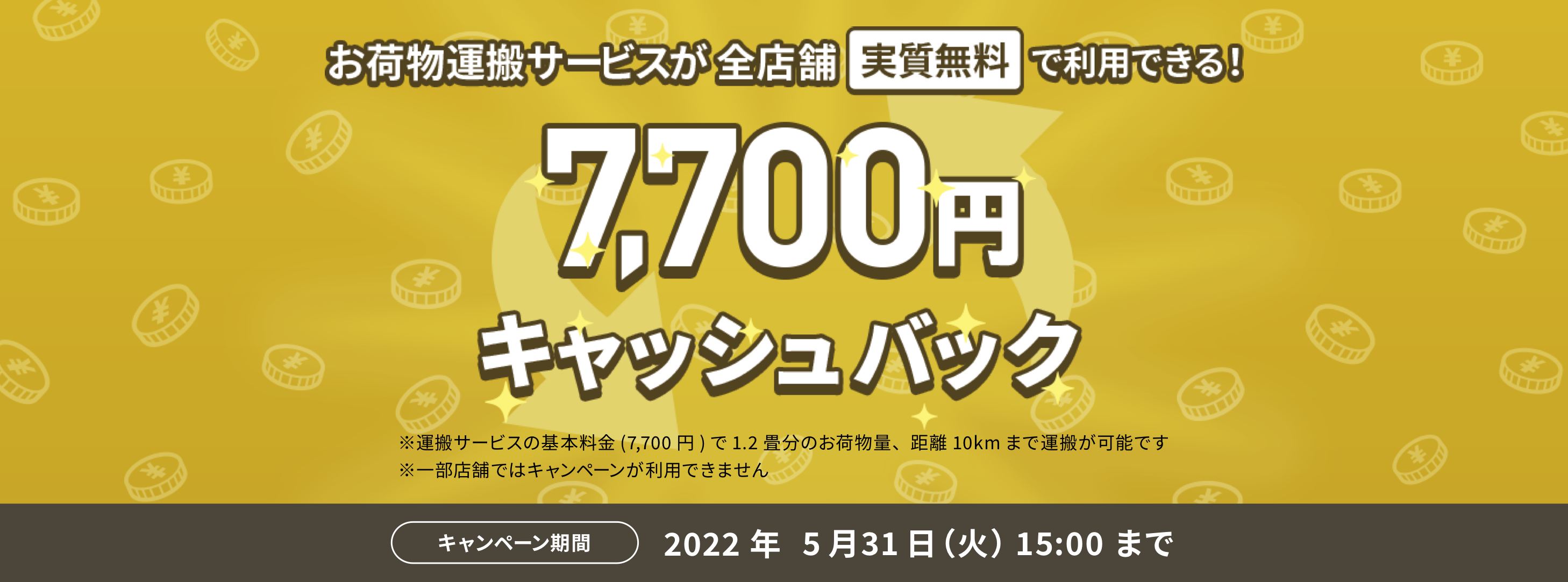 アンビシャス/「お荷物運搬サービス」の実質無料キャンペーンを実施 物流全般 2023.06.17 関⻄で店舗数No.1のトランクルーム「収納ピット」 大好評「お荷物運搬サービス」の実質無料キャンペーンを実施 〜 24時間365日対応、マイカーがない方や遠方の方のご利用も安心 〜 トランクルームと自宅・職場等間の荷物運搬・出し入れがネット申込で完結利便性の高いサービスを無料で体験できるチャンス 店舗数関西No.1のトランクルーム「収納ピット」を展開する株式会社アンビシャス (本社所在地︓⼤阪市中央区、代表︓徳永 暢也)は、好評展開中の「お荷物運搬サービス」をより多くのお客様にご活用いただくことを目指し、このたび「お荷物運搬サービス実質無料キャンペーン」を実施します。収納ピットは日本初の「いつでもオンラインでお荷物の出し入れを申し込めるトランクルーム※」です。「お荷物運搬サービス」では自宅・職場等とトランクルーム間の荷物の運搬・出し入れを契約期間中いつでも・何度でもプロにおまかせできます。しかも、24時間365日対応・インターネットで申込可能なので、思いついた時にスマホ等でサッと依頼して気軽に荷物の出し入れができるのも大きな魅力です。(※100店舗オープン以上のレンタル収納スペース事業者を調査。当社調べ) 今回「お荷物運搬サービス」の利便性をより多くのお客様に知っていただき、体験していただくことができるよう「お荷物運搬サービス実質無料キャンペーン」を実施します※。運搬の基本料金となる7,700円を後日キャッシュバックすることで「お荷物運搬サービス」を実質無料でご利用いただくことが可能です。(※一部対象外の店舗がございます。) この機会に是非、簡単なネット手続でご自宅等にいながら荷物の出し入れができる「お荷物運搬サービス」の利便性とプロに任せる安心感をお得にご体験ください。 【キャンペーン期間】2022年2月15日(火)〜2022年5月31日(火)15:00までの申込が対象(2022年6月30日(木)までに荷物運搬が完了している必要があります。) 【キャンペーンの適用条件】・クレジットカードでご契約の方が対象→後日マイページにご登録のクレジットカード口座にキャッシュバック ・新規契約者も契約中の方もキャンペーン利用可能→新規契約時の割引キャンペーンと併用可能 ・キャンペーン期間中の申込・6/30までの荷物運搬完了が必要→運搬が終われば自動的にキャンペーン申込完了 ・基本料金で距離10km以下・1.2畳分の荷物を運搬可能→この条件で実質無料に。これらを超える運搬の場合、発生した差額はご負担となります 【注意事項】・トランクルーム1つの契約につき1回のみのキャンペーン適用となります。・キャッシュバック方法はクレジットカードのみ対象です。あらかじめマイページにクレジットカードをご登録ください。他の支払方法の場合キャッシュバックはできません。・キャッシュバックはキャンペーン参加確認以降、順次行います。ただし、ご契約のクレジットカード会社様によってはご入金時期が遅れる場合があります。 【詳細はこちらへ】「お荷物運搬サービス実質無料キャンペーン」https://www.syuno-pit.biz/transport-campaign 「お荷物運搬サービス紹介ページ」https://www.syuno-pit.biz/transport.html ■様々な状況のお客様のニーズに応える「お荷物運搬サービス」トランクルームを利用する上でネックとなりやすいのが、重い・大きい・量の多い荷物の運搬です。例えば、高齢者・マイカーを保有しない方・コロナ禍で外出を控えている方・自宅からトランクルームまで近くない方等にとって、荷物の運搬と出し入れが大きな負担になりがちです。 この問題の解決策として、自ら荷物を運ぶことなくトランクルームが利用できる「お荷物運搬サービス」があります。荷物を収納できるトランクルームがあっても荷物の運搬や出し入れが不安、という方に是非ご利用いただきたいサービスです。 近年のコロナ禍の影響で自宅で過ごす時間やテレワークが増加し、自宅の環境を整えたいというニーズが増えていることから、トランクルームへのニーズが高まっています。だからこそ、より多様な状況下でご利用いただくお客様のニーズに応え、気軽に・便利に利用できる「お荷物運搬サービス」を追求し展開しています。 ■荷物移動の負担軽減がトランクルーム利用の活発化につながる弊社がトランクルーム未契約者に行ったアンケートにおいて「トランクルームを利用したくなるサービス」の第1位は「お荷物運搬サービス」でした。他にも弊社が行っている多くの調査で「お荷物運搬サービス」へのニーズの高さが顕著に現れています。 荷物の運搬が難しい状況にある方はもちろん、そのような状況でない方にとっても、トランクルームに行き荷物を出し入れする・運搬する手間の大変さを感じる人は多く、時間がなかなか取れないケースも多々あるはずです。面倒さ・億劫さだけでも、その方にとって結果的にトランクルームの利