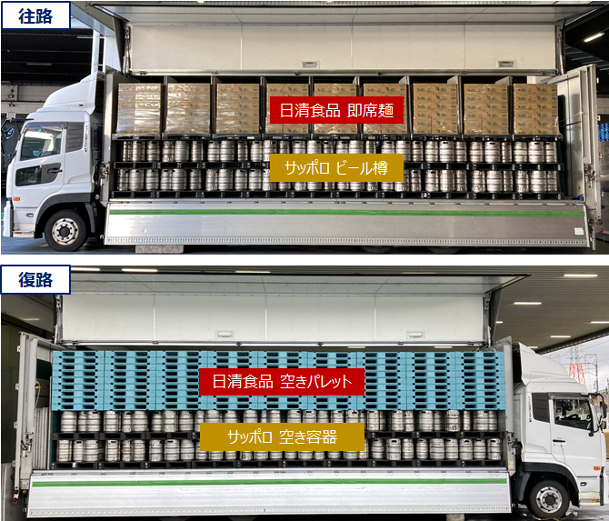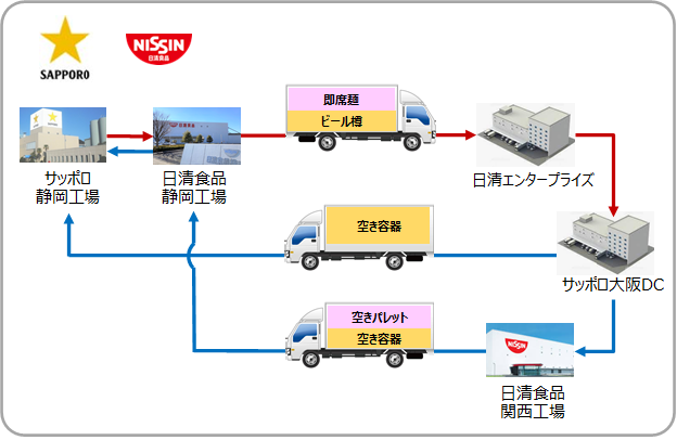 サッポログループ物流/日清食品とビールと即席麺を組み合わせた共同輸送を3月2日より静岡~大阪間で開始 グリーン物流(環境) 2023.06.17 サッポロの”ビール”と日清食品の”即席麺”を組み合わせた共同輸送を開始 トラック使用台数が約20%減少し、CO2排出量を年間で約10t削減 サッポロホールディングス(株)のグループ企業であるサッポログループ物流株式会社(代表取締役社長:西間木 健二、以下サッポログループ企業はサッポロ)と日清食品株式会社 (代表取締役社長:安藤 徳隆、以下日清食品) は、ビールと即席麺を組み合わせた共同輸送を3月2日より静岡~大阪間で開始します。 静岡県焼津市に生産工場を持つサッポロと日清食品は、静岡~大阪間の輸送において、往路は両社の製品を混載し、復路は空き容器や空きパレットを混載する「ラウンド輸送(注1)」のスキームを確立しました。 これまで往路においては、重量貨物であるサッポロのビール樽を最大積載重量まで積載しても、荷台上部にスペースができる一方で、軽量貨物である日清食品の即席麺を荷台の容積一杯まで積載しても積載可能重量に余裕がありました。また復路では、両社とも往路に比べて貨物量が少なく、満載にするのが難しい場合がありました。こうした問題の解決に向けて両社で実証試験を重ねた結果、往路では両社の製品の種類や数量の組み合わせを調整することで、また、復路ではサッポロの空き容器と日清食品の空きパレットを混載することで、積載率を高めながら100%の実車率(注2)を実現する「ラウンド輸送(注1)」のスキームを確立しました。これにより、両社が個別に輸送していた従来の方法に比べ、トラックの使用台数は約20%減少し、CO2排出量は年間で約10t削減(注3)できる見込みです。 サッポロと日清食品は、「人づくりから始まるSCM改革」をテーマに、昨今の物流クライシスへの対応や次世代ロジスティクス人材の育成といった課題の解決に取り組んできました。サッポロでは2019年から「サッポロロジスティクス★人づくり大学」を、日清食品では2020年から「SCM Academy」を開催しており、受講生同士の交流も生まれています。今回の取り組みは、それぞれの受講生のアイデアを踏まえて実現したものです。 サッポロと日清食品は、これからも互いに協力しながら、物流に関わる諸課題の解決と持続可能な社会の実現を目指すSDGs達成に貢献していきます。 ■「ラウンド輸送(注1)」のスキームについて“動脈物流(注4)”と呼ばれる往路ではサッポロと日清食品の製品輸送を、”静脈物流(注5)”と呼ばれる復路では空き容器や空きパレットなどの資材輸送を効率的に組み合わせることで、積載率の向上を図ります。<往路>サッポロは静岡工場 (静岡県焼津市) から大阪物流センター(大阪府大阪市、以下大阪DC) まで、日清食品は静岡工場 (静岡県焼津市) から日清エンタープライズ (大阪府摂津市) まで製品をそれぞれ輸送していました。今後は、サッポロ静岡工場でビール樽を積載したトラックが日清食品静岡工場に立ち寄り、即席麺製品を積載後に大阪へ輸送し、それぞれの倉庫で荷降ろしします。<復路>サッポロは大阪DCから静岡工場まで、日清食品は関西工場 (滋賀県栗東市) から静岡工場まで空き容器や空きパレットなどをそれぞれ輸送していました。今後は、サッポロ大阪DCから空き容器などを積載して輸送するトラックについて、満載の場合はサッポロ静岡工場へ直接向かい、荷台スペースに余裕がある場合は日清食品関西工場で空きパレットを積載してから静岡へ輸送し、それぞれの工場で荷降ろしします。 <実施前> <実施後> ■積載方法について往路では、重量貨物であるサッポロのビール樽をトラックの最大積載重量で積載しても、荷台上部にスペースができていました。そこで、一部のビール樽を日清食品の即席麺に置き換えて満載にすることで、重量面と容積面の双方でほぼ100%の積載率を実現することができます。復路では、サッポロの空き容器などで満載にできない場合、空いたスペースに日清食品の空きパレットを積載することで、積載率を高めて運行することができます。 (注1) トラックに積み込んだ貨物を目的地で降ろした後、別の貨物を積み込んで出発地まで帰ってくることによって、空車回送区間をなくし、車両の配送効率を高める輸送形態のこと。(注2) 輸送効率の指標の1つで、トラックが走行した距離のうち、実際に貨物を積載して走行した距離の比率のこと。(注3) 今回の「ラウンド輸送」を週2便運行することにより見込まれる1年間あたりのCO2排出削減量。燃費法にて実施前後のCO2排出量を算出。(注4) 原材料の調達や、製品をお客さまに配送するための物流。(注5) 空き容器や輸送段階で発生する資材などを回収し再使用するための物流。 以上