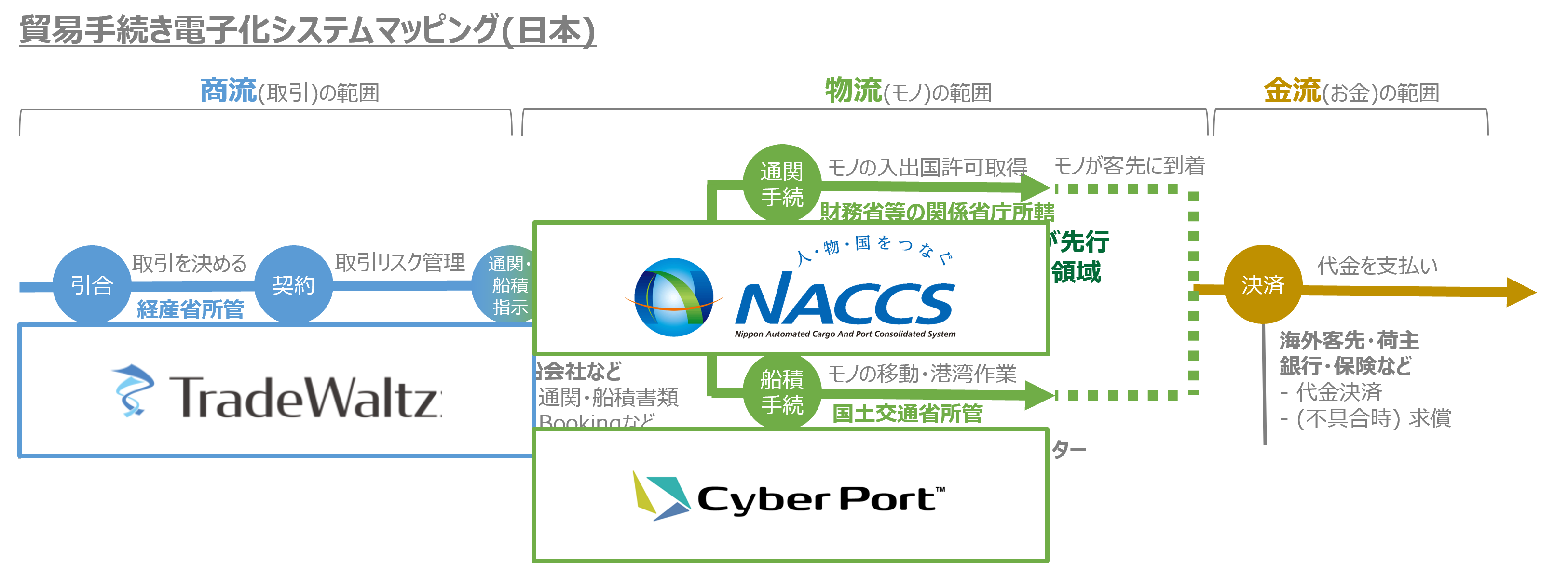 トレードワルツ/日本標準の貿易プラットフォームの構築を目指しTradeWaltz-Cyber Portの協働を発表 物流システム 2023.06.17 日本標準の貿易プラットフォームの構築を目指し、TradeWaltz-Cyber Portの協働を発表 ~海外との取引成立から物流手続まで含めた完全電子化へ~ 貿易に関する上流情報の連携プラットフォーム「TradeWaltz®」を運用する株式会社トレードワルツ(以下:トレードワルツ)と民間事業者間の物流手続等を電子化する「Cyber Port」を運用する国土交通省 港湾局は、今後システム間連携を行い、日本標準の貿易プラットフォームの構築を目指す協働を発表いたします。 ■日本で進んできた貿易電子化と、残された課題 非資源国である日本は、過去の歴史を通じ、海外から原料を輸入し、製品をつくり海外へ輸出することで、大きな経済発展を遂げてきた貿易立国です。時代と共に世界各国は密接につながり、貿易の件数や金額は右肩上がりで上昇し続けてきたことで、過去から続いてきた「紙書類をベースとしたアナログ貿易」ではとても量をこなしきれなくなりました。 貿易手続の中で通関領域に関しては、NACCSにより貿易の電子化が先行している一方、残る領域は依然として紙書類やFAX、PDF等によるアナログ手続が多く、非効率、リモートワークが難しい、ステータスが分かりづらいなどの問題が山積しており、デジタル化による解決が望まれています。 ■貿易手続のアナログ領域を埋めていく2つのプラットフォームの登場 こうした課題の解決を図るため商流・金流において、経済産業省の支援を受けながら産官学All Japanの体制で2020年に生み出された民間貿易プラットフォームが「TradeWaltz」であり、主に荷主・金融機関・保険会社・物流会社・船会社、商工会議所などとのやりとりを電子化する取組を進めています。 また国土交通省と内閣官房情報通信技術(IT)総合戦略室(現 デジタル庁)が、物流手続等の電子化に向け、物流関係団体等とも連携して構築し、2021年に第一次運用を開始した物流プラットフォームが「CyberPort」であり、荷主・船社・船舶代理店・海貨業者・NVOCC/国際フォワーダー・倉庫業者・通関業者・ターミナルオペレータ・陸運業者などの民間事業者間のやりとりを電子化する取組を進めています。 これらの国内の貿易電子化の動きを連動させるべく、これまでにもNACCS-TradeWaltz間での連携に向けた協業2020年11月12日に発表(※1)してきた他、NACCS-Cyber Port間でも連携機能の実装を2022年4月15日に発表(※2)してきましたが、今回はTradeWaltz-CyberPort間を連携させていく協働の発表となります。 ※1)https://www.naccs.jp/news/data/20201112/20201112.pdf※2)https://www.mlit.go.jp/report/press/port05_hh_000206.html システム連携の詳細については調整中のため、決まったものから今後順次発表を進めてまいります。 ■今後国内の貿易プラットフォームを普及していくために 今後、日本の貿易実務者へプラットフォームの利用を促し、貿易データを電子化・ネットワーク化していくためには、国際連携も見据えた、国内の貿易データ標準仕様を作成すること等が有効と考えられます(※3)。こうした観点も含め、貿易プラットフォームの普及に向けて、今後も貿易分野デジタル化に向けた官民の取組に積極的に関わってまいります。 ※3)参考:経産省主催「貿易関連デジタル化の在り方研究会」より https://www.meti.go.jp/meti_lib/report/2021FY/000762.pdf ■関係者のコメント 株式会社トレードワルツ 代表取締役社長 小島 裕久「今回、国土交通省様と共に、日本の貿易プラットフォーム連携に向けた、協働の発表をできることを、大変嬉しく思います。日本だけでなく世界中が貿易デジタル化を国家施策と捉え、官民一体となって取り組む現在、日本の関係者も今回の協働によりオールジャパンとして一丸となって取り組めますので、これからより一層貿易デジタル化の動きを加速させて参ります。」 国土交通省 港湾局長 浅輪 宇充「諸外国において貿易手続の電子化の取り組みが進められる中、我が国においても、商流・金流・物流からなる貿易手続を一気通貫で電子化することで、貿易手続を全体最適化し、携わる民間事業者の生産性向上を図ることが重要だと考えています。この目標に向け、この度トレードワルツ様と共に協働の発表ができることを喜ばしく思うとともに、官民一体となって貿易手続の電子化の取組を加速させて参ります。」 トレードワルツについて(https://www.tradewaltz.com)トレードワルツは、紙をベースとした、日本やアジアのアナログな貿易を、ブロックチェーンベースの完全電子化貿易に変えていくDXスタートアップです。NTTデータと主要な貿易実務者18社からなるオールジャパンの貿易コンソーシアムで約4年間のシステム開発・技術実証、法改正提案、事業構想を経て、サービス化。株式会社NTTデータ、東京大学協創プラットフォーム開発株式会社、三菱商事株式会社、豊田通商株式会社、株式会社TW Link(兼松JV)、東京海上日動火災保険株式会社、三
