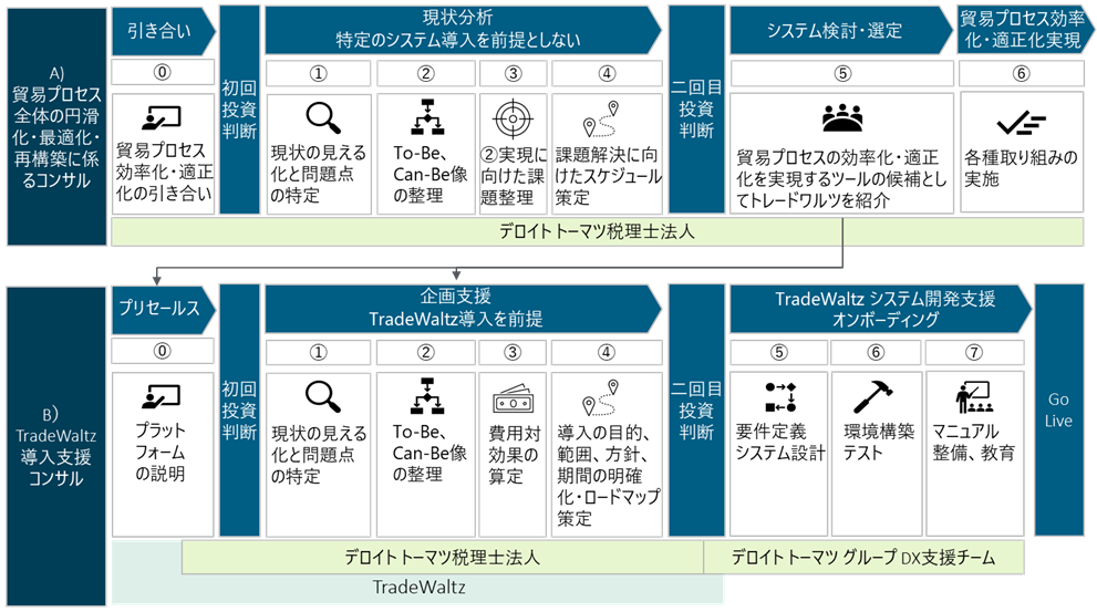 デロイト トーマツ/トレードワルツと協業範囲を拡大 物流システム 2023.06.17 デロイト トーマツとトレードワルツ、協業範囲を拡大し、貿易プロセス改善と電子化を融合させたサービスを展開 2022年1月の電子帳簿保存制度改正を契機とした貿易実務全体の棚卸し・見直し及び電子化のニーズに対応し、業務の最適化に関するコンサルティングサービス等を提供 デロイト トーマツ グループのデロイト トーマツ 税理士法人(以下デロイト トーマツ)と貿易情報連携プラットフォーム「TradeWaltz」を運営する株式会社トレードワルツ(以下:トレードワルツ)は、貿易業務の完全電子化に向けて、協業の範囲を、貿易関係帳簿・書類の電子化から、貿易プロセス全体の円滑化・最適化・再構築に係るコンサルティングサービスに拡大します。 デロイト トーマツとトレードワルツが昨年5月に、電子帳簿保存コンサルティングサービスに係る協業を開始して以降、国交省におけるCyber Portの利用者拡大に向けた取り組みや、AIを活用した税関事後調査先の選定、リモートでの事後調査などの官側の取り組みに加え、国際的な貿易プラットフォーム立ち上げの活性化、NACCS、Cyber PortとTradeWaltzの連携など、民側及び官民合同で、貿易プロセスIT化に向けた動きが、さらなる加速を見せています。 このような状況の中、足元では、貿易関係帳簿・書類の電子化を契機に、貿易書類の電子化のみではなく、貿易実務全体の棚卸し・見直し+IT化の検討・実施したいという事業者が増えてきています。しかしその一方で、事業者からは、今後、民間のプラットフォームはどこが主流になるのか、Cyber Port、NACCSなどの官側のシステムとの連携はどうなるのか、電子保存に係る税関の運用や税関事後調査対応はどうなるのか、システム導入の前後で、自社の貿易業務はどう変わるのか、といった悩みや戸惑いの声もあがっています。 デロイト トーマツとトレードワルツは、こうした事業者の課題や不安を解決する取り組みを進めていきます。今回の協業拡大により、デロイト トーマツが窓口となって提供する貿易プロセスの効率化・適正化コンサルティングサービスの中で、これを実現するツールの候補の一つとして「TradeWaltz」を紹介し、またトレードワルツは、「TradeWaltz」の導入を検討している事業者に対して、コンサルティングサービスの提供者としてデロイト トーマツを紹介するなど、相互協力のもとで、事業者の貿易プロセスの改善と電子化を推進します。 また7月より、デロイト トーマツが提供しているクラウドベースのHSコード検索エンジン「Trade Search」を、「TradeWaltz」の連携App Store上でも提供していく予定です。 デロイト トーマツとトレードワルツは貿易業務の完全電子化に向けて、今後もさらなる取り組みを図っていきます。 <貿易プロセス全体の円滑化・最適化・再構築に係るコンサルティングサービス>