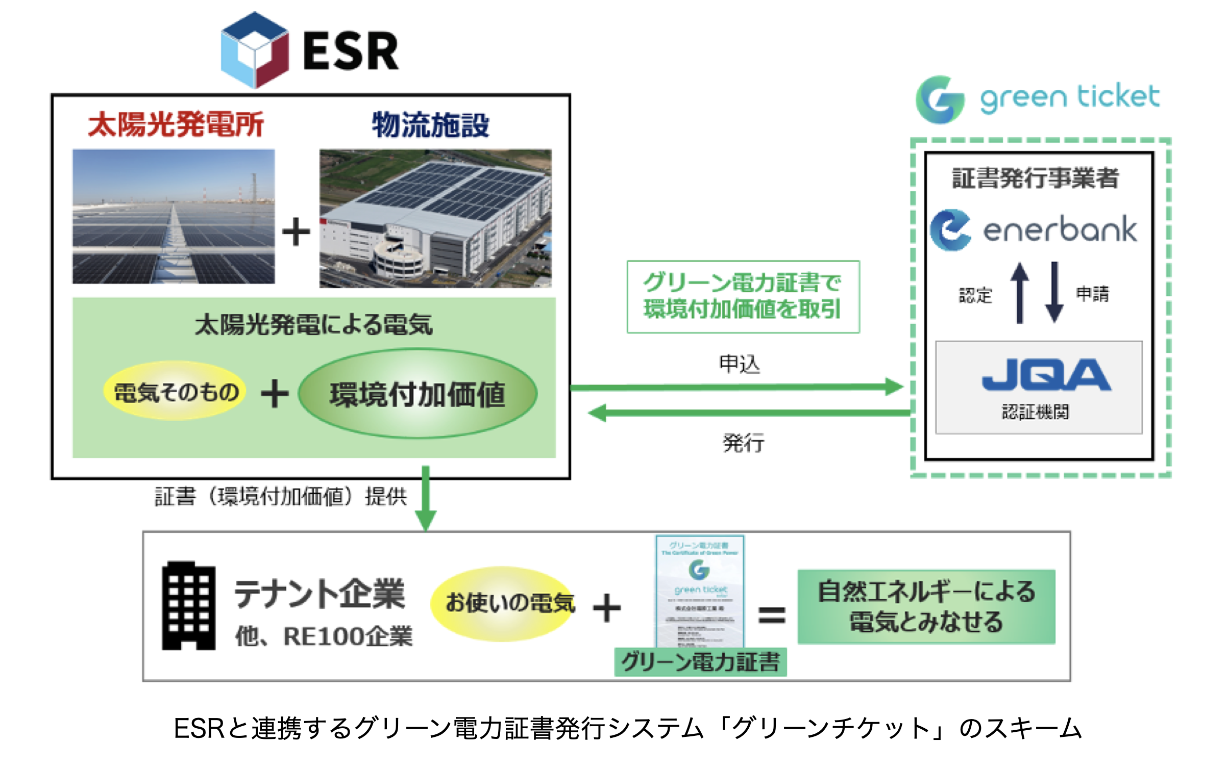 エナーバンク/ESRとグリーン電力証書発行システムで連携、証書を発行 グリーン物流(環境) 2023.06.17 アジア太平洋地域最大の不動産アセットマネジメント会社ESRとグリーン電力証書発行システムで連携、証書を発行 ~追加性のある再エネ価値をテナント企業に販売開始〜 株式会社エナーバンク(共同創業者 代表取締役:村中 健⼀、本社:東京都中央区)は、ESR株式会社(代表取締役:スチュアート・ギブソン、本社:東京都港区 以下、ESR)が開発・運営する物流施設レッドウッド藤井寺ディストリビューションセンターとESR久喜ディストリビューションセンター(DC)の自家消費型太陽光発電所に対してグリーン電力証書発行システム「グリーンチケット」で連携し、2022年3月にグリーン電力証書を発行しました。 グリーン電力証書発行システム「グリーンチケット」でESRと連携 ESRでは2021年8月「レッドウッド藤井寺DC」(大阪府藤井寺市)、同12月「ESR久喜DC」(埼玉県久喜市)で自家消費型太陽光発電所を稼働しています。エナーバンクがグリーン電力証書発行事業者となり、ESRが所有するグリーン電力設備認定を受けた太陽光発電設備からの環境価値を、当社のグリーン電力証書発行システム「グリーンチケット」を介してグリーン電力証書として発行します。グリーン電力証書発行システムではJQAに発電実績を認証された電力量の範囲内で、テナント企業様のみならずCO2排出量削減に積極的に取り組む一般企業様とも、グリーン電力証書により環境付加価値を取引することが可能です。 2022年3月24日、太陽光発電設備の設計施工等を手掛ける株式会社福原工業(代表取締役:福本明達 本社:大阪府大阪市)に対し、レッドウッド藤井寺DCで発電した自家消費用電力の内、28万kWhを環境付加価値としたグリーン電力証書を発行しました。 グリーン電力証書について 「グリーン電力証書システム」とは、省エネルギー(化石燃料の節減)や温暖化抑制といった再生可能エネルギーの「環境付加価値」を、証書発行事業者が第三者認証機関(一般財団法人日本品質保証機構 以下、JQA)の認証を得て、「グリーン電力証書」という形で可視化し取引する仕組みです。 グリーン電力証書を購入した企業・自治体等は、発電設備を持たなくても、証書に記載された電力量(kWh)相当分の再生可能エネルギーを使用したとみなされ、再生可能エネルギーの普及に貢献し、CO2削減を行っているといえます。また、CDP、RE100などの各種環境報告書に、再生可能エネルギーの使用量やCO2削減量として報告することができます。さらに、一定の手続きを経て、地球温暖化対策推進法の調整後温室効果ガスの削減や東京都や埼玉県等の環境条例における再エネクレジットとしても活用可能です。 一方、再生可能エネルギーの発電施設を持つ事業者は環境付加価値の提供による収入を得ることができ、グリーン電力の維持に貢献することができるため、この「追加性」がある点も重要視されています。エナーバンクは2019年9月24日にグリーン電力証書発行事業者(事業者コードA65)として登録しています。 グリーン電力証書発行システム「グリーンチケット」について 再生可能エネルギー発電由来の環境価値を発電事業者と創出し、グリーン電力証書発行システム「グリーンチケット」を介してグリーン電力証書の発行を行います。 RE100企業やゼロカーボンシティ自治体、エネオクを利用したユーザーに、追加性のあるグリーン電力証書を販売し、購入企業のRE100の実現や環境貢献PRへの活用を支援します。 <<グリーンチケットサイト>>https://www.greenticket.jp/ ESRについて ESRは先進的物流施設・データセンターを両輪としたニューエコノミー不動産プラットフォームを形成するアジア太平洋地域(APAC)最大の不動産アセットマネジメント会社です。 2006年にレッドウッド・グループとしてその歩みを始め、2016年イーシャンとの経営統合によりESR設立、日本法人レッドウッド・グループ・ジャパン株式会社は現・ESR株式会社に社名変更。2019年11月1日に香港証券取引所に上場。2022年1月20日にARAアセットマネジメントの買収完了、APAC最大かつ上場企業として世界第3位の不動産アセットマネジメント会社になりました。 現在、香港にグループ本社を置き、日本・中国・韓国・シンガポール・インド・オーストラリア・ニュージーランド・インドネシア・ベトナムで事業を展開し、欧米にもネットワークを広げています。 開発においては『HUMAN CENTRIC DESIGN.』を基本理念に、弊社施設で働くワーカーにとって快適で、環境にも配慮した施設の創出に力を入れています。日本では三大都市圏(首都圏・関西圏・中部圏)と九州を中心に物流施設・データセンターを開発しており、アジア最大の延床面積を誇る「ESR尼崎ディストリビューションセンター」他26の物流施設を竣工させ、12プロジェクトを開発中。 エナーバンクについて エナーバンクは、電力オークションシステムの開発・運営、グリーン電力証書発行事業、太陽光