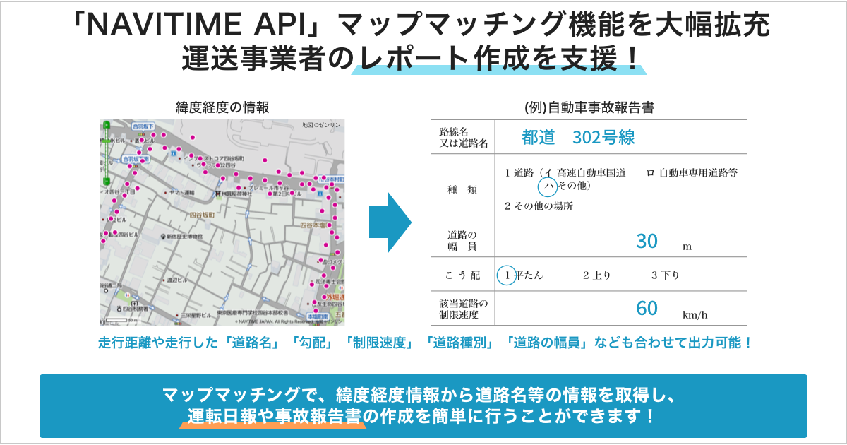 ナビタイムジャパン/「NAVITIME API」マップマッチング機能を大幅拡充し、運送事業者のレポート作成を支援 物流システム 2023.06.17 『NAVITIME API』マップマッチング機能を大幅拡充し、運送事業者のレポート作成を支援 ~物流業界の2024年働き方改革関連法施行に向けて、運転日報や報告書作成をサポート!~ 株式会社ナビタイムジャパン(代表取締役社長:大西啓介、本社:東京都港区)は、2022年8月31日(水)より、法人向け地図・ルート検索API『NAVITIME API』にて、運送事業向けに、マップマッチング機能を大幅に拡充いたします。 これまでは、補正後の緯度経度情報と走行した日付のみの出力でしたが、今回の大幅拡充によって、走行距離や走行した道路名、勾配、制限速度、道路種別、道路の幅員なども合わせて出力できるようになります。 これらの情報は、自動車運送事業者等が自動車事故を起こしてしまった場合に、運輸局に提出する義務のある「自動車事故報告書」の記載事項となっており、報告書作成を効率化し、業務負担を軽減できます。また、トラックドライバーの運転日報作成に必要な、運転開始と終了の日時、運転した距離、走行した道路などの項目にも対応しており、業務負担の軽減や労働時間削減をサポートします。 API形式で提供することで、運送事業者向けのサービスや、自社でシステム開発を行っている物流会社などで、現在お使いのサービス/システムへ機能を追加する形でご利用いただけます。1リクエストあたり最大1000地点までの走行データを送信することが可能で、送信データのフォーマットはJSON形式とCSV形式から選べます。 2024年の物流業界での働き方改革関連法施行に向けて、長時間労働の改善や業務効率化が求められる中で、報告書作成業務の効率化を支援することで、物流業界に貢献できればと思っております。 出力できる主な項目 走行距離、走行した道路名、勾配、制限速度、道路種別、道路の幅員、運転開始と終了の日時、など 関連プレスリリース/お知らせ ・2019年12月9日 『NAVITIME CONNECT API』 、マップマッチング機能を追加https://corporate.navitime.co.jp/topics/pr/201912/09_5149.html 『NAVITIME API』について 『NAVITIME API』は、『NAVITIME』『カーナビタイム』等で提供する「トータルナビ」や、自動車、電車、バス、自転車など様々な移動手段のルート検索、地図表示などの機能を、業務システムやWebサイト、アプリなどに簡単に組み込めるAPIサービスです。バスや車にも対応した交通費精算などの業務支援サービスでの利用や、巡回経路検索による配送・移動の最適化などの業務効率化、トータルナビ検索による店舗案内や移動のシミュレーションなど、様々な用途でお客様の業務を支援しています。https://api-sdk.navitime.co.jp/api/