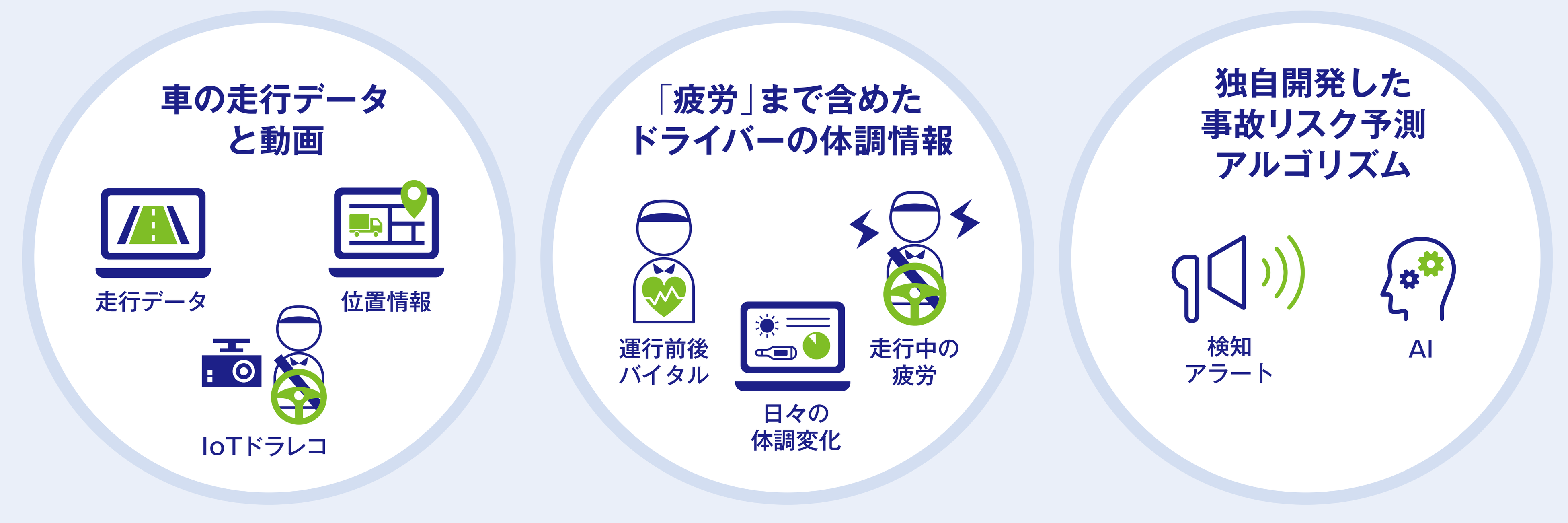 「SSCV-Safety」はドライバーの体調と運行を見守り、運転事故につながる危険要因を検知し、未然に事故を防ぐことを目的とした安全運行管理ソリューションです。ドライバーの運行前後および運行中の生体データと、ドライブレコーダや車両の挙動などから取得した運転データをAIで分析し、産官学連携により開発した事故リスク予測アルゴリズムとテクノロジーを組みあわせ、ドライバー自身では気づきにくい「疲労」や「ストレス」を可視化・通知することで事故を未然に防ぎます。