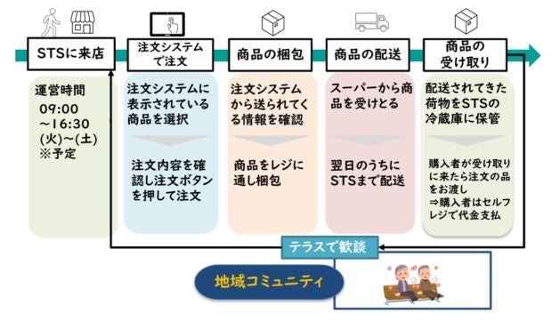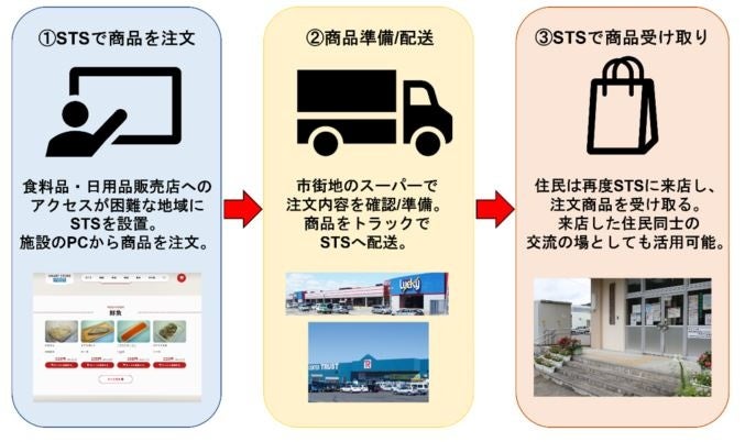 本実証実験では、地域のコミュニティストア「Smart Terrace Store(STS)」を適切な場所に設置し、地域住民の小売店までの物理的な距離を短縮することで、食料品アクセスの向上を図ります。また、STSの設置が難しい地域の住民へは、新技術「ドローン」を活用した食料品配送を実施することによる、食料品アクセス手段の提供を目指します。