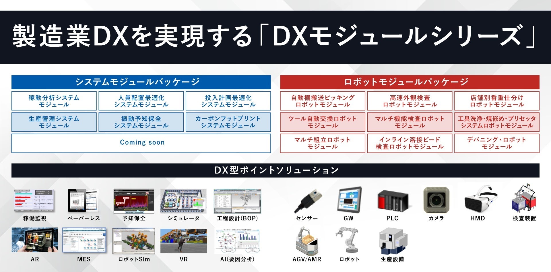 Team Cross FA/「データの見える化のその先」・「変種変量生産への対応」、機器やシステムを目的に応じて最適に組み合わせたパッケージサービス 製造業DXを実現する「DXモジュールシリーズ」を提供開始 物流システム 2023.06.17 「データの見える化のその先」・「変種変量生産への対応」、機器やシステムを目的に応じて最適に組み合わせたパッケージサービス 製造業DXを実現する「DXモジュールシリーズ」を提供開始 発表第1弾、今後もラインナップを順次拡充 製造業のDXから生産ラインの開発・実装までを包括的に支援するコンソーシアム「Team Cross FA(チームクロスエフエー)」の幹事企業の1つである株式会社FAプロダクツ(本社:東京都港区、代表取締役:貴田義和 以下、当社)は、製造業のDX(デジタルトランスフォーメーション)において、必要な機器やシステムが、目的にあわせて組み合わされたパッケージサービス「DXモジュールシリーズ」を提供開始いたします。今回は第1弾の発表となり、今後拡充されていくラインナップにつきましては順次発表いたします。 DXモジュールシリーズとは 「DXモジュールシリーズ」は、ロボットSIer主導のファクトリビルダーとしてのTeam Cross FA各社の総合力と、数々の業界・お客様の自動化やDXを推進してきたノウハウから生み出された、「製造業におけるDX」を実現するサービスです。 これまで数々の製造業企業がDXに対する対応意識を持ちながらも、何から始めるべきかわからないことや、投資対効果が不明瞭であることなどを理由に、その推進には二の足を踏んでいました。今回の「DXモジュールシリーズ」では、生産投入計画の最適化やカーボンニュートラルの実現など、実現したい目的に応じて必要な機器やシステムが「最適」に組み合わされたパッケージ型のサービスとなっています。多様化する製造業界のDXにおける課題に合わせて、本サービスは今後も拡充予定です。 Team Cross FAはDXモジュールシリーズを通じて、日本の製造業のDXを推進してまいります。 〈「DXモジュールシリーズ」を順次紹介する発表セミナーを実施します〉日程 :2022年12月2日(金) 13:00-13:30 ※申込〆切:11月30日(水)23:59参加費用 :無料形式 :YouTubeを使ったLive配信(オンライン)形式申込URL :https://fa-products.jp/factory/sf-live_20221202-2/※今後も順次開催してまいります。 ラインナップの一部を紹介 ※今後順次発表 見える化のその先を提供する「デジタル活用モジュール」これまで数々のお客様や業界のDXを推進してきた実績から、お客様のお悩みの中でも特に多い課題を解決すべくパッケージ化されたサービスです。従来のデジタルソリューションはデータ収集をメインとした「見える化」がメインでしたが、本サービスでは、単なる見える化に留まらず、その活用と投資対効果の明確化も実現する「見える化のその先」を提供します。 ■稼働分析モジュール これまで稼働状況のデータ収集では、手入力や集計、あるいは誤記入や誤字のため、都度入力者に確認が必要になるなどの手間がかかっていました。また、データを収集しても、その分析方法や活用方法が分からない、そもそもどのデータをどのように収集すればいいかわからないなどの課題がありました。「稼働分析モジュール」では、新旧さまざまな生産設備や、作業者のデータも同じ仕組みでデータ収集が可能です。取得したデータは、現場側が必要なデータは「現場TPM」で、管理者側で必要なデータは「マネージメント画面」でそれぞれ表示するなど、データを活用するレイヤーに応じて利用しやすい形で表示することができます。また、データ演算も実施できるため、コスト換算、エネルギーコストやCo2排出量なども表示することができます。▼導入のメリット・TPM活動のアウトプットに直結ロスの明確化による意識改革改善成果の見える化によるモチベーションアップ人・設備・原単位の効率化・事業所、経営目線でのマネジメントに直結各種予実管理(付加価値・経費・生産性稼働率等)在庫回転効率化(原材料・仕掛・完成品)不良・不適合品の減少 ■投入計画最適化モジュール これまでの投入計画は、基幹システム等からの受発注に対して熟練者が「カン・コツ」に基づいて行うもので、属人的かつ対応に時間がかかるものでした。「投入計画最適化モジュール」では、生産シミュレータを活用して、実際の工場ラインのモデルをデジタル上に構築。実態に合ったシミュレーションを短時間で行います。これまで熟練者による「カン・コツ」で行われてきた様々な判断基準をデジタル化し、無数にある複雑な投入計画の中から最適なものを算出するサービスです。▼導入のメリット・生産効率の向上既存設備の稼働率/生産性の向上段取り替えのタイミングを最適化前日までの出来高実績や在庫/仕掛品の状況などを反映し、適時計画の立案が可能特急対応の生産に対して、全体で納期遅れが発生しない投入順序の立案が可能・属人化の解消誰でも簡単に、時間をか