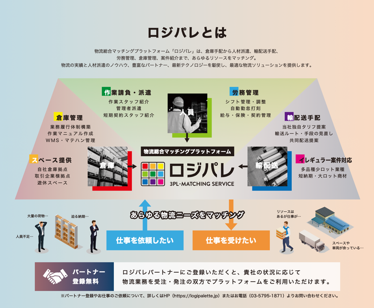 ロジテックが新たに提供する「ロジパレ」は、ビジネスマッチングを通して「人材」をはじめとした事業リソースの確保を可能とするサービスで、荷主企業のほか、倉庫・運輸等の物流企業にも利便性を提供します。
